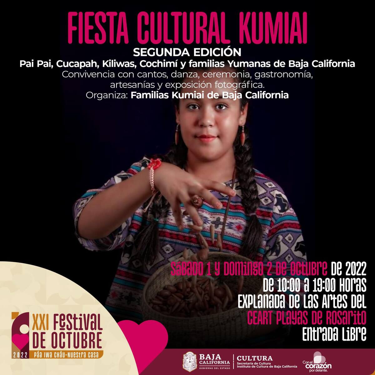 Rosarito, B.C.- Promover las culturas nativas de Baja California, es el objetivo del evento denominado “Fiesta Cultura Kumiai”, que tendrá lugar los días 1 y 2 de octubre en la explanada del Centro Estatal de las Artes, en Rosarito.