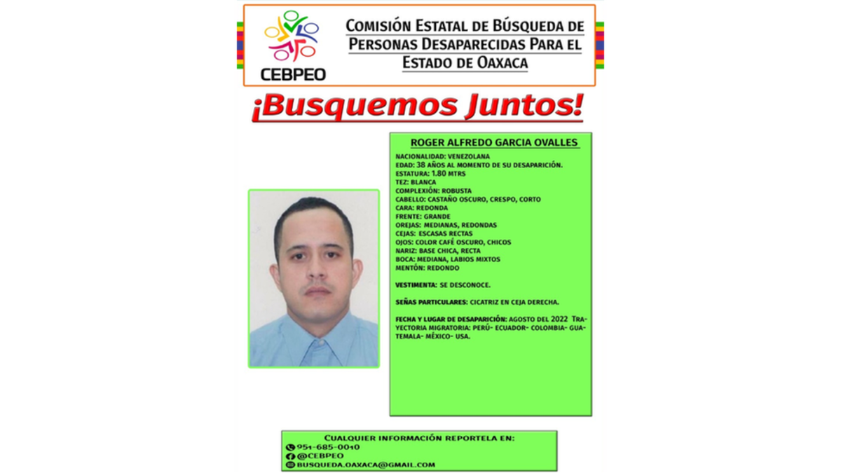 Edgar acudió a la Comisión Nacional de Búsqueda de Personas Desaparecidas de Oaxaca, que emitió un boletín el 24 de noviembre de 2022 sobre Roger, desaparecido "en trayecto migratorio", y que fue publicado también por el estado de Coahuila, fronterizo con Estados Unidos.