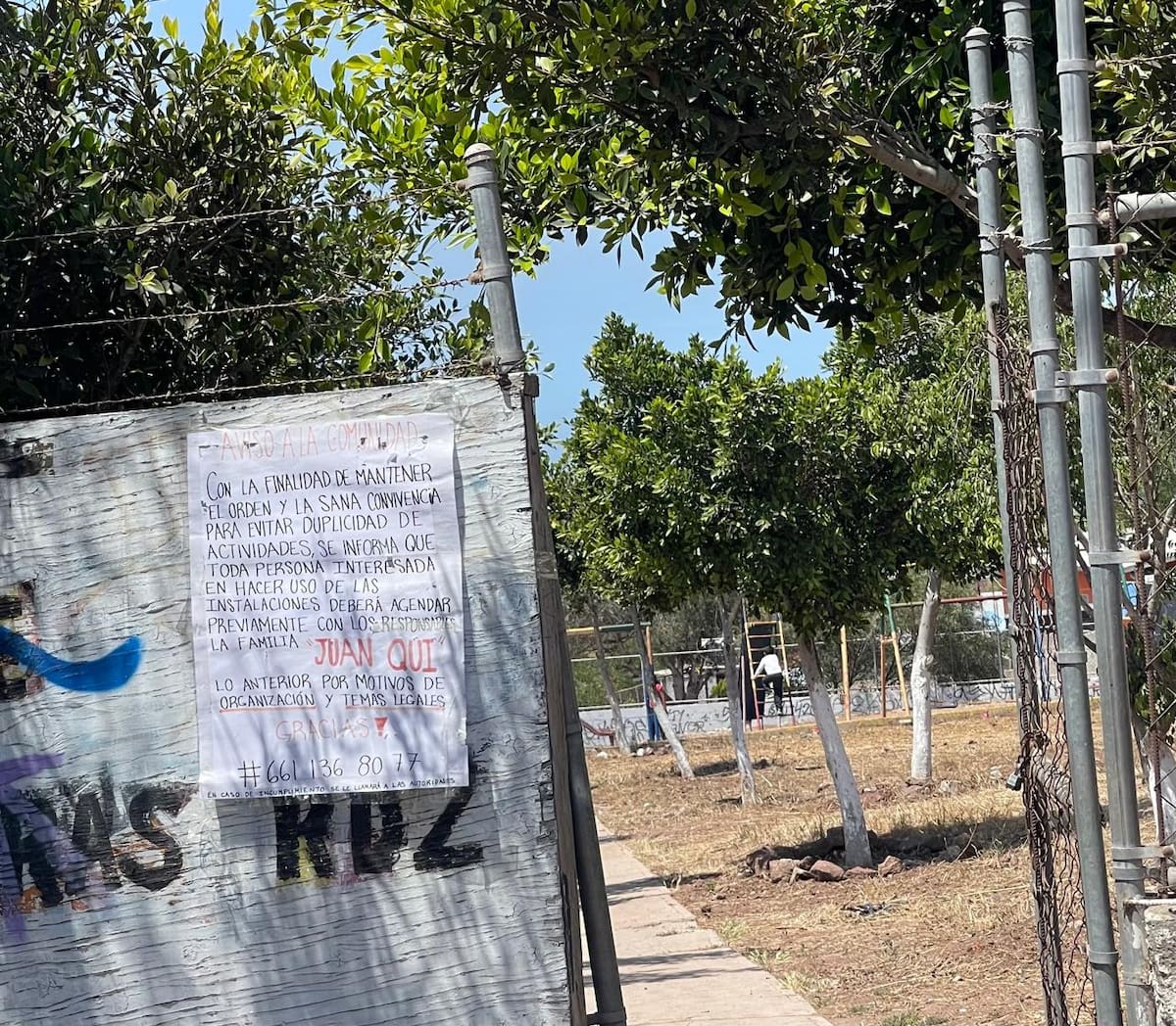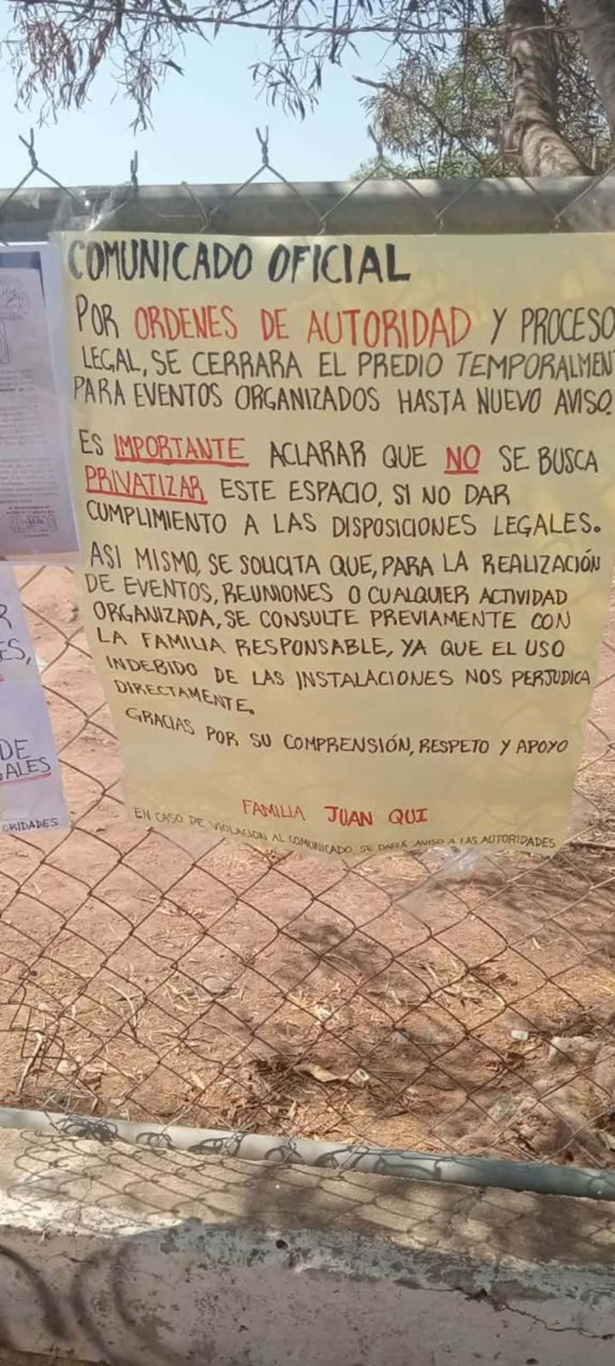 Este lunes, la puerta de las canchas deportivas se encontraba abierta, pero tenía pegada una cartulina que a la letra decía “Aviso a la comunidad, con la finalidad de mantener el orden y la sana convivencia para evitar duplicidad de actividades, se informa que toda persona interesada en hacer uso de las instalaciones deberá agendar previamente con los responsables la familia ‘Juan Qui’, lo anterior por motivos de organización y temas legales”, además con letras pequeñas se advierte que en caso de incumplimiento se llamará a las autoridades.