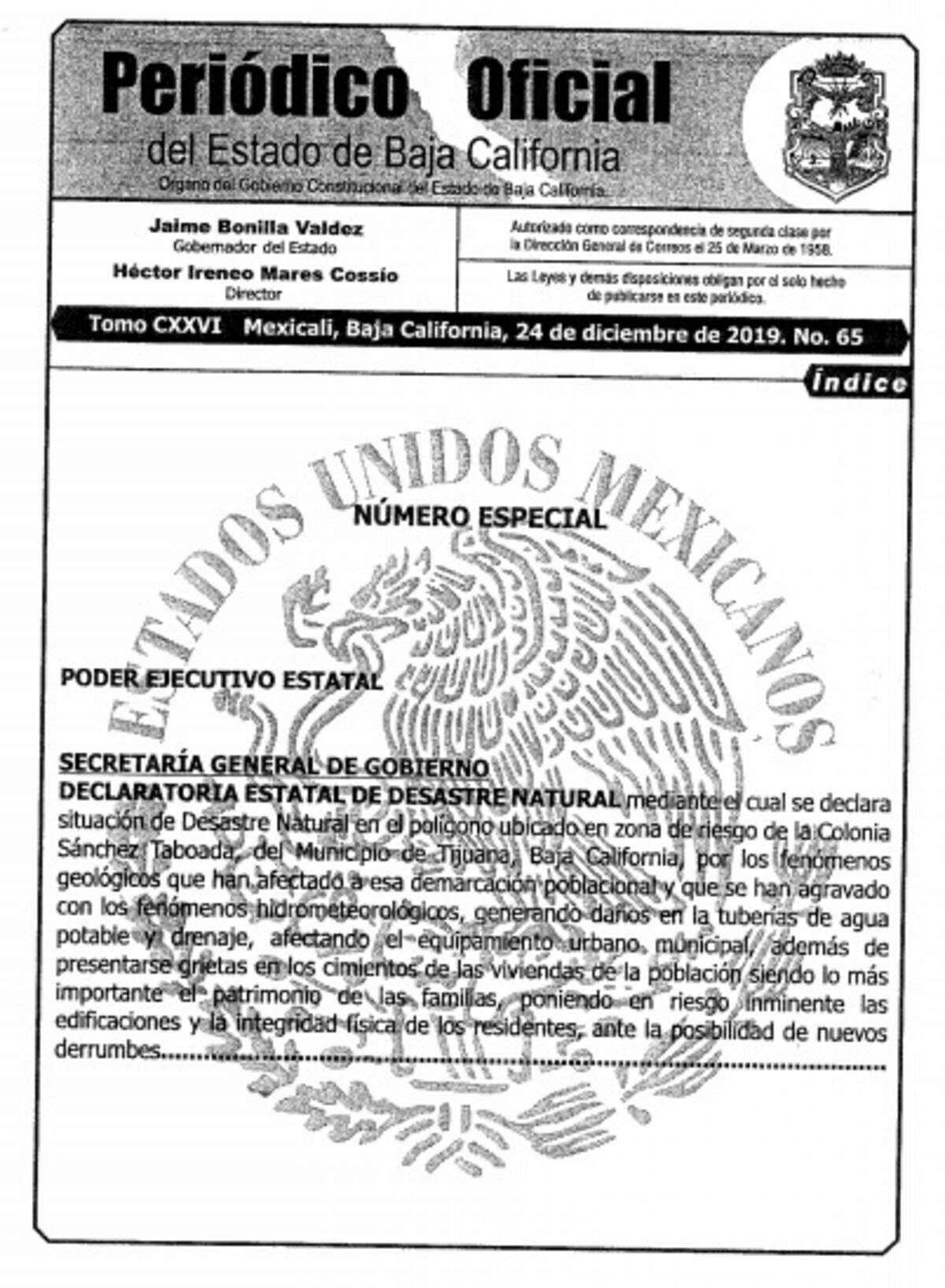 La Declaratoria Estatal de Desastre Natural fue publicada en el Periódico Oficial del Estado de Baja California, luego de ser firmado por el Gobernador Jaime Bonilla Valdez y el Secretario General de Gobierno, Amador Rodríguez Lozano.
