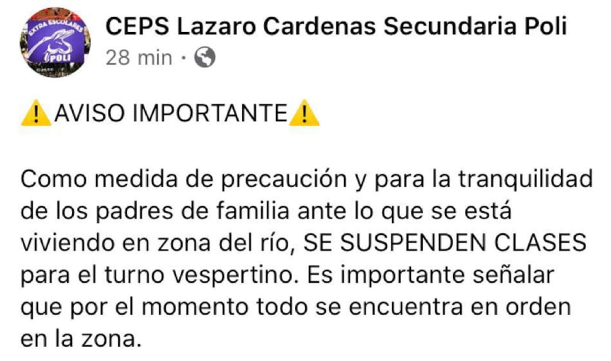 Tijuana, BC.- A través de las redes sociales las autoridades de la Secundaria número 1 o "Poli" informaron que suspenderán las clases del turno vespertino.
