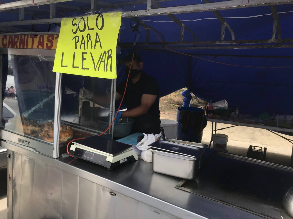 Los puestos de comida en el sobreruedas de Villa del Campo, también tuvieron que adaptarse a las medidas sanitarias y su venta la hacen solo para llevar, la encargada del puesto Elizabeth Parra, “La Michoacana”, contó que su venta cayó un 60%.