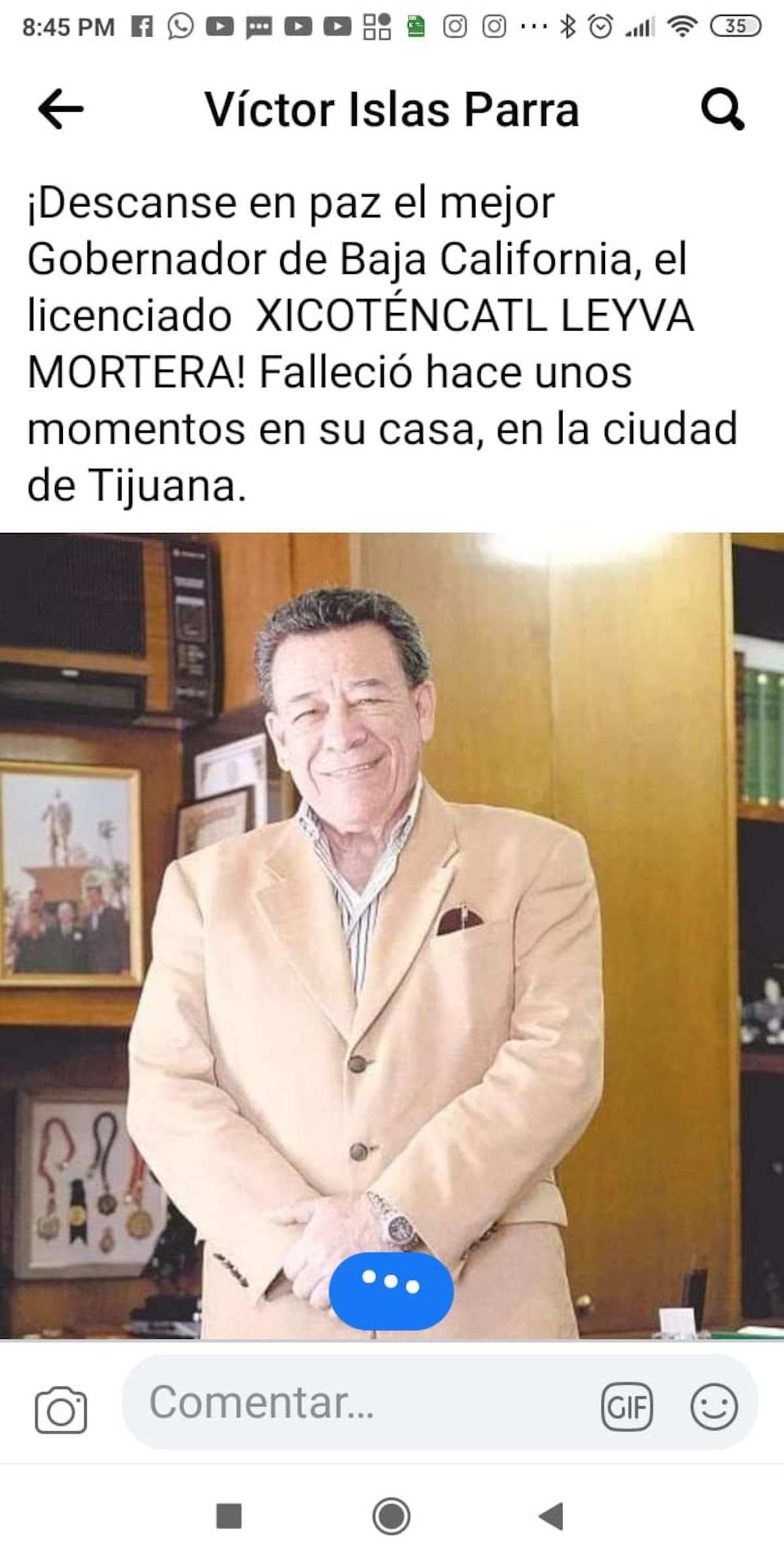 Tijuana, B.C.- A los 81 años falleció este jueves el ex gobernador priista de Baja California, Xicoténcatl Leyva Mortera.
