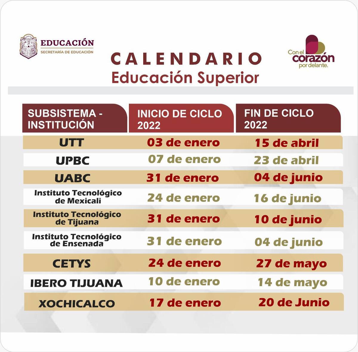 MEXICALI, BC. – Como parte de la difusión de los calendarios de reinicio de clases en los diferentes niveles educativos en el estado, la Secretaría de Educación da a conocer a toda la comunidad estudiantil del nivel superior en la entidad el calendario de actividades de inicio de ciclo.