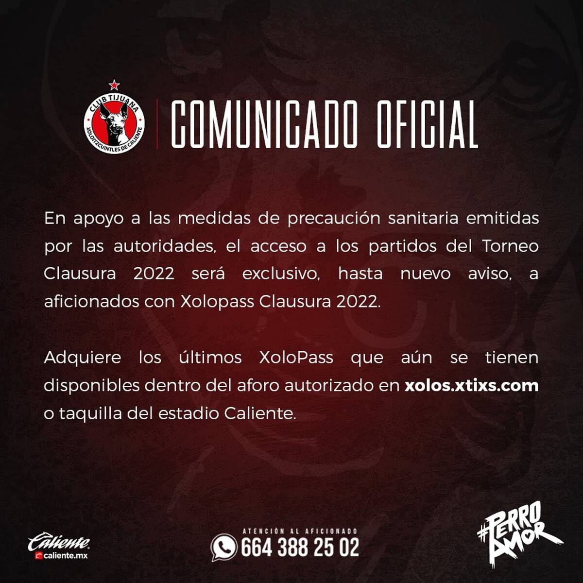 “En apoyo a medidas de precaución sanitarias emitidas por las autoridades, el acceso a los partidos del torneo Clausura 2022 será exclusivo, hasta nuevo aviso, a aficionados con Xolopass Clausura 2022”, se puede leer en sus redes sociales.