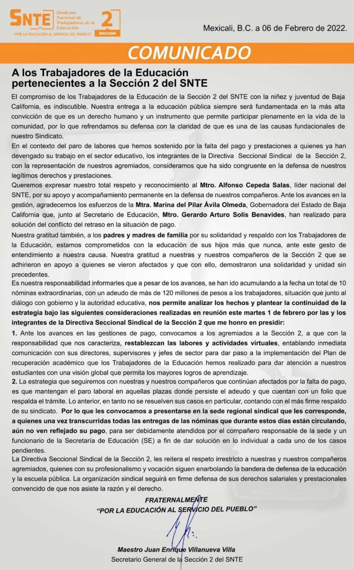 Tijuana, B.C.- Por medio de un comunicado, el maestro Juan Enrique Villanueva Villa, secretario general de la sección 2 del Sindicato Nacional de Trabajadores de la Educación (SNTE), convocó a los docentes de la sección a restablecer las labores y actividades virtuales correspondientes.