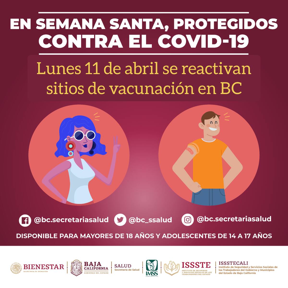 Mexicali.– Para acercar la vacuna contra el COVID-19 a la mayor población posible, la Secretaría de Salud en coordinación con autoridades federales, determinaron que a partir del lunes 11 de abril, los hospitales generales y centros de salud en la entidad, ofrecerán la aplicación del biológico.