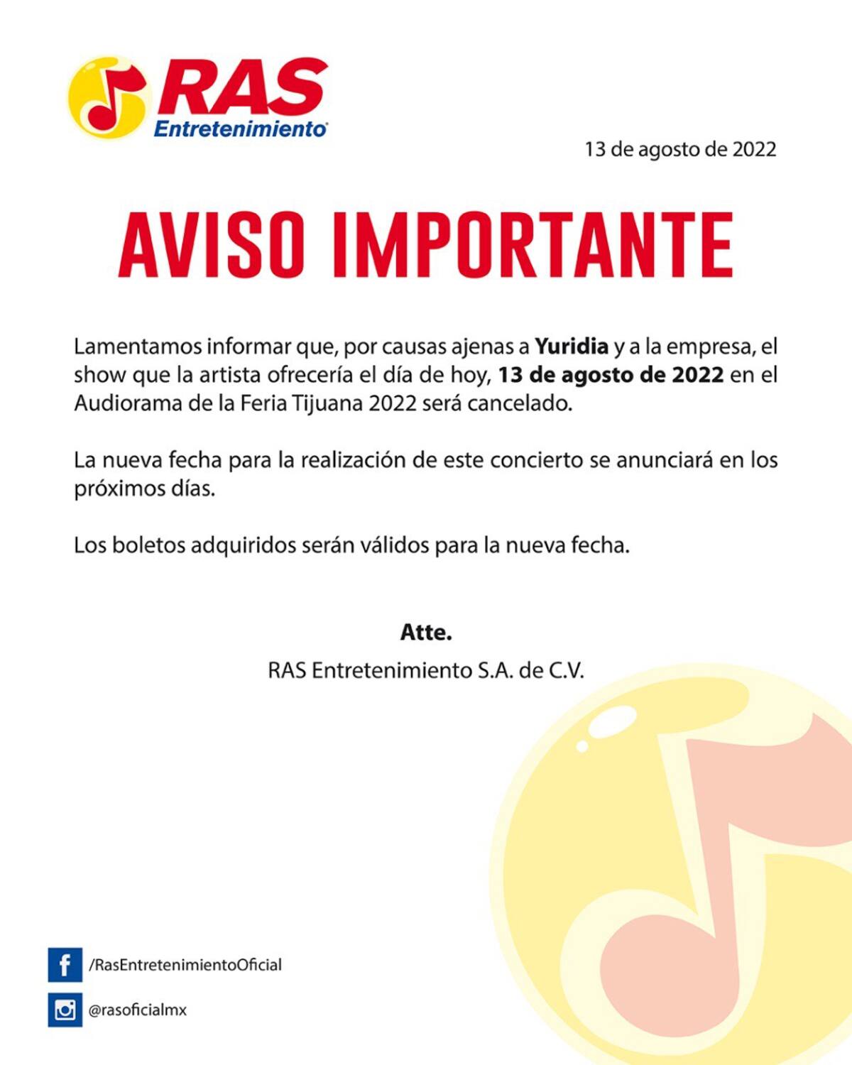 RAS Entretenimiento que lleva la batuta del recinto ferial emitió esta mañana un comunicado en el que indica que por causas ajenas a ellos, la fecha programada para este sábado 13 se ve pospuesta.