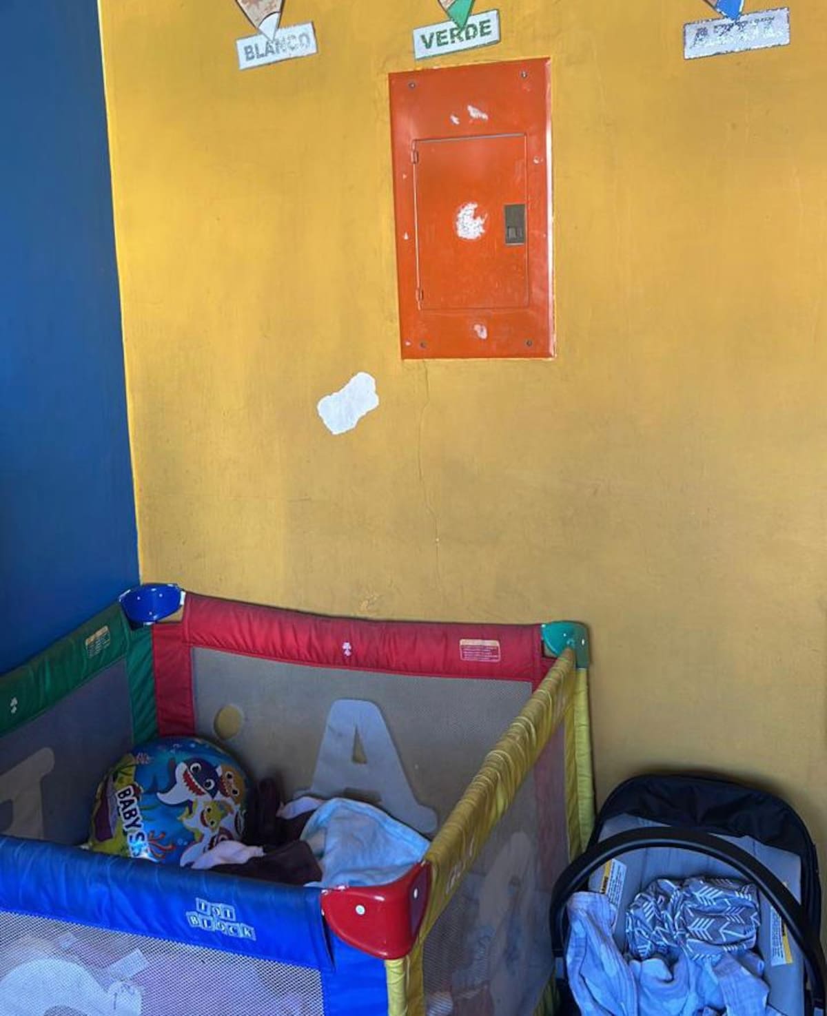 Uno de los salones no tenía extintores, detectores de humo, rutas de evacuación ni protectores en la toma de corriente; en el segundo salón había un centro de carga de alto voltaje justo arriba de una cuna tipo corral, con un menor dormitando al momento de la inspección, y cielos y muros en malas condiciones.
