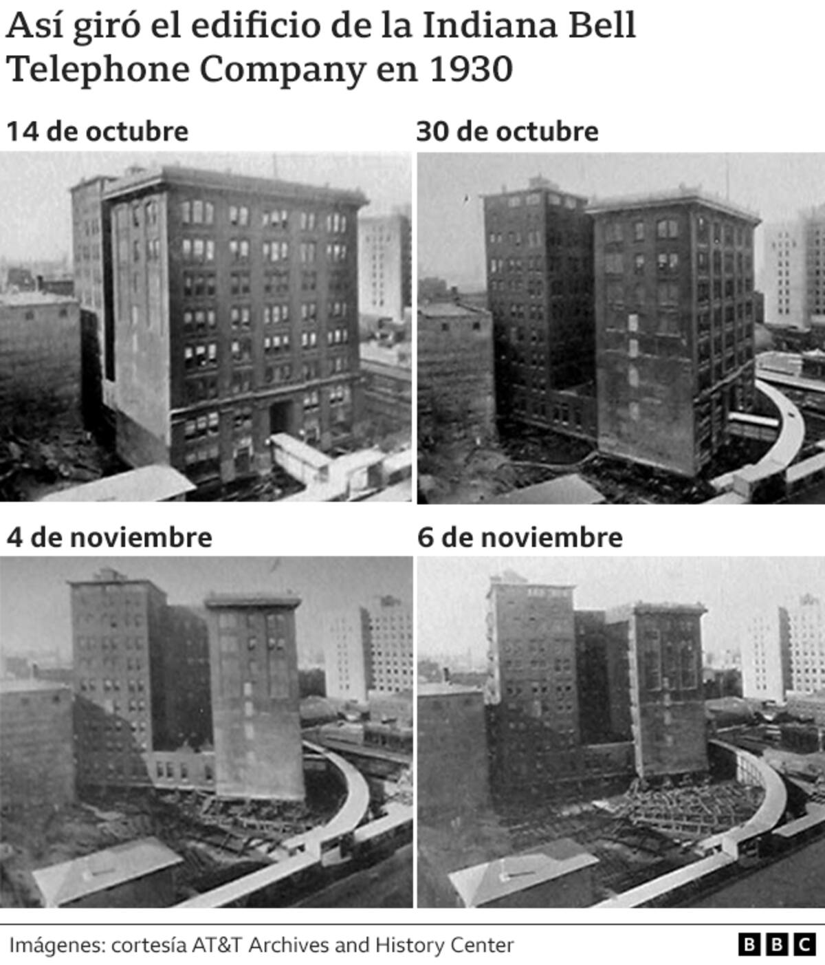 En el caso de la sede de Indiana Bell Telephone Company, en Indianápolis, Estados Unidos, lo que se hizo es un poco más complicado: la construcción fue pivotada 90 grados en horizontal.