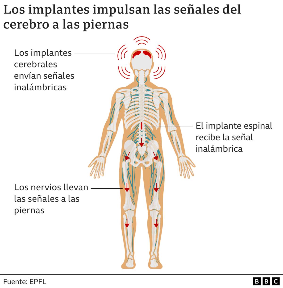 Los implantes electrónicos transmiten inalámbricamente sus pensamientos a las piernas y pies por medio de un segundo implante en la médula espinal.