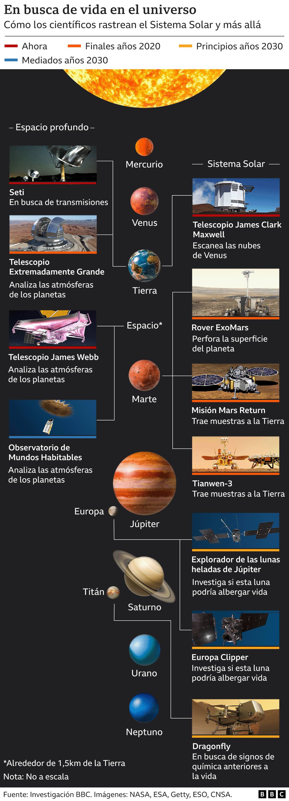 Estas son sólo algunas de las muchas misiones que están en marcha o previstas para los próximos años en busca de signos de vida en los planetas de nuestro Sistema Solar; otras buscan mucho más lejos, en el espacio profundo.