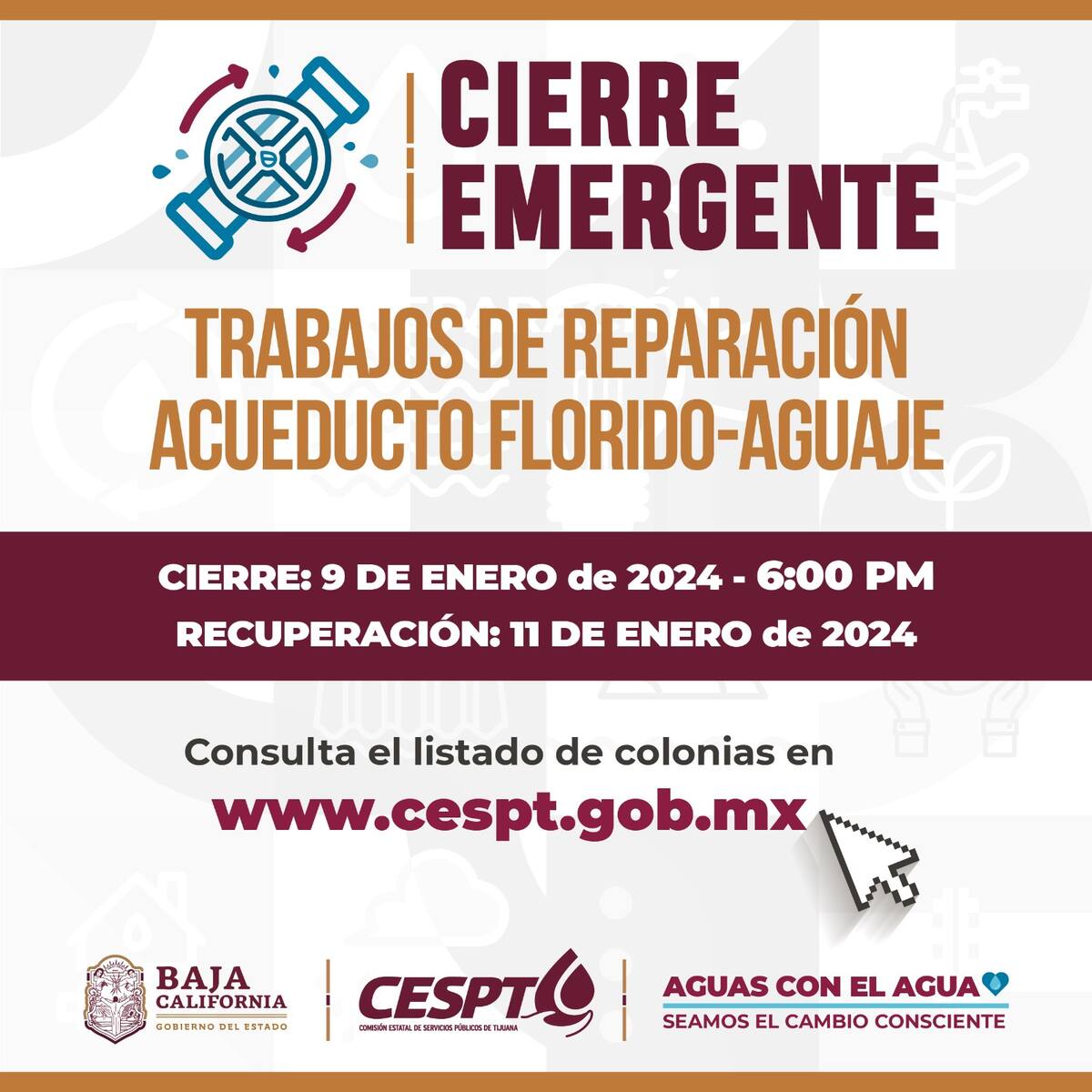 Tijuana, B.C.- La Comisión Estatal de Servicios Públicos de Tijuana (CESPT) informa que fue localizada una fuga en el Acueducto Florido-Aguaje, que requiere atención inmediata y cuyos trabajos de reparación requieren del cierre emergente del suministro de agua potable a partir de las 18:00 horas de este martes 9 de enero, por un lapso de 34 horas, incluyendo la recuperación del servicio, para las 632 colonias que se abastecen de dicha línea en Tijuana y Playas de Rosarito.