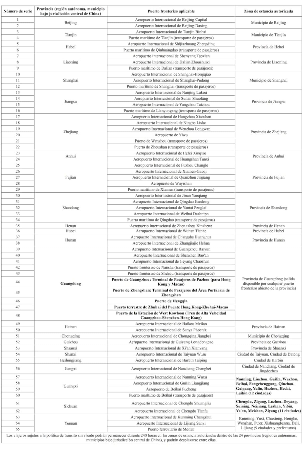 Los ciudadanos de estos países que posean un documento de viaje internacional válido y un billete de tránsito con fecha y asiento confirmados, y que viajen hacia un tercer país o región a través de China, pueden ingresar sin visado a través de cualquiera de los 65 puertos de entrada abiertos en 24 provincias y permanecer en la zona designada no más de 10 días.